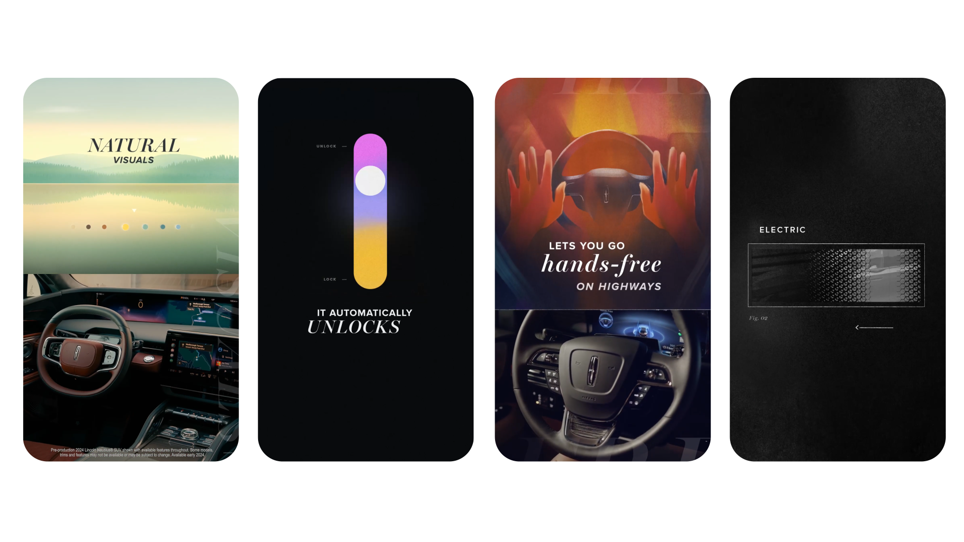 Each piece focuses a specific detail, from Horizon Lines (bringing the outside view into the dashboard experience), to BlueCruise (hands free driving), to First Impressions (upgraded entry lighting and welcome moments), along with comfort and safety features like a smoother ride and assisted lane change detection.
