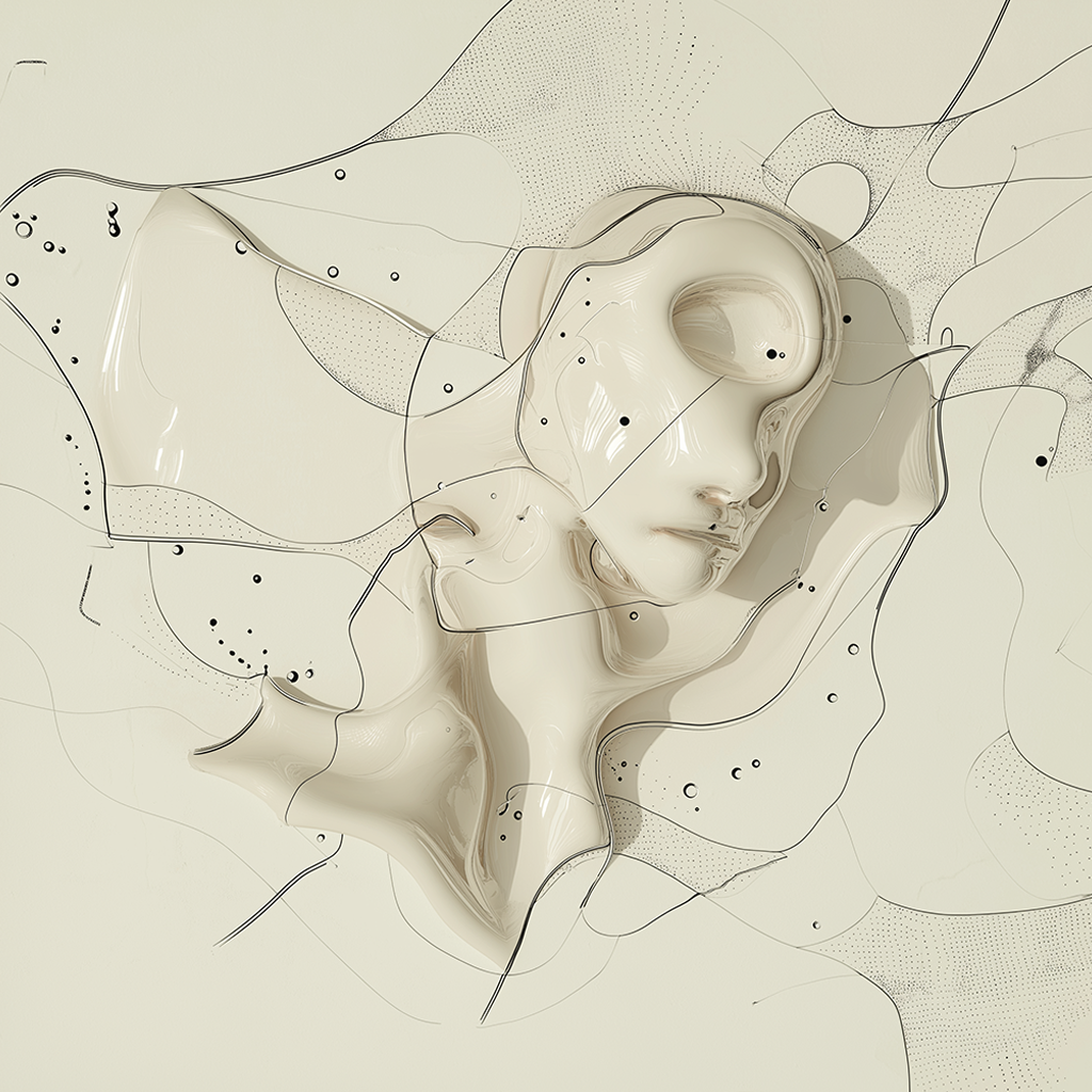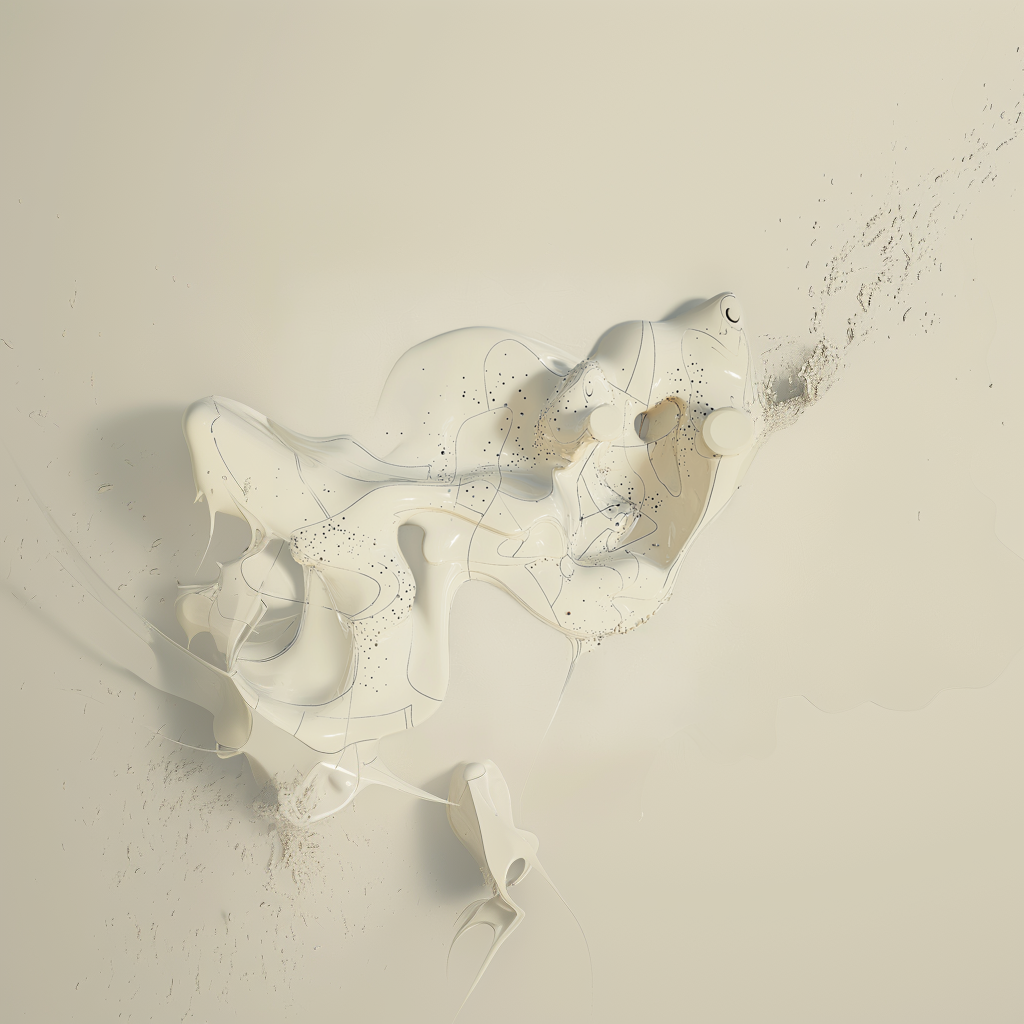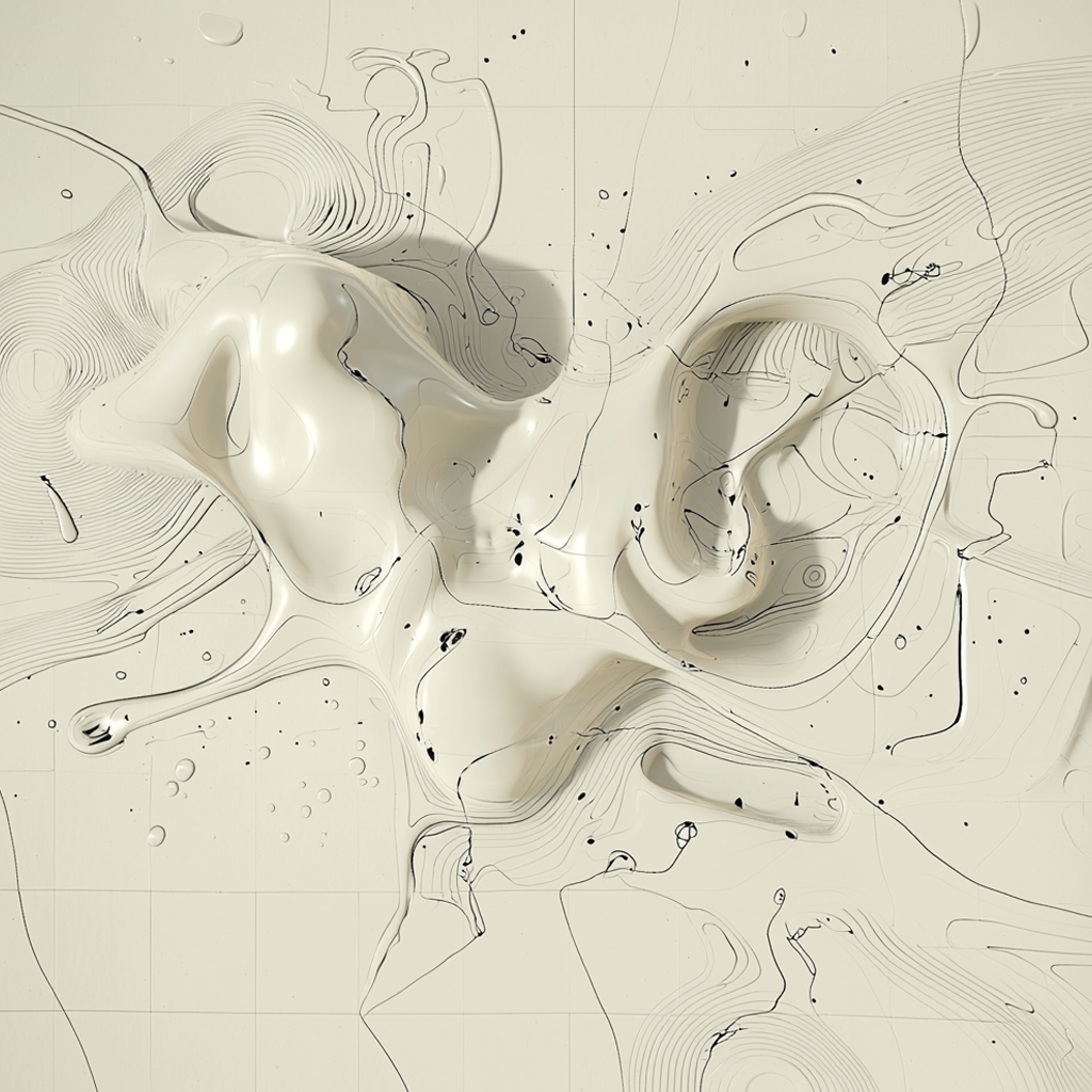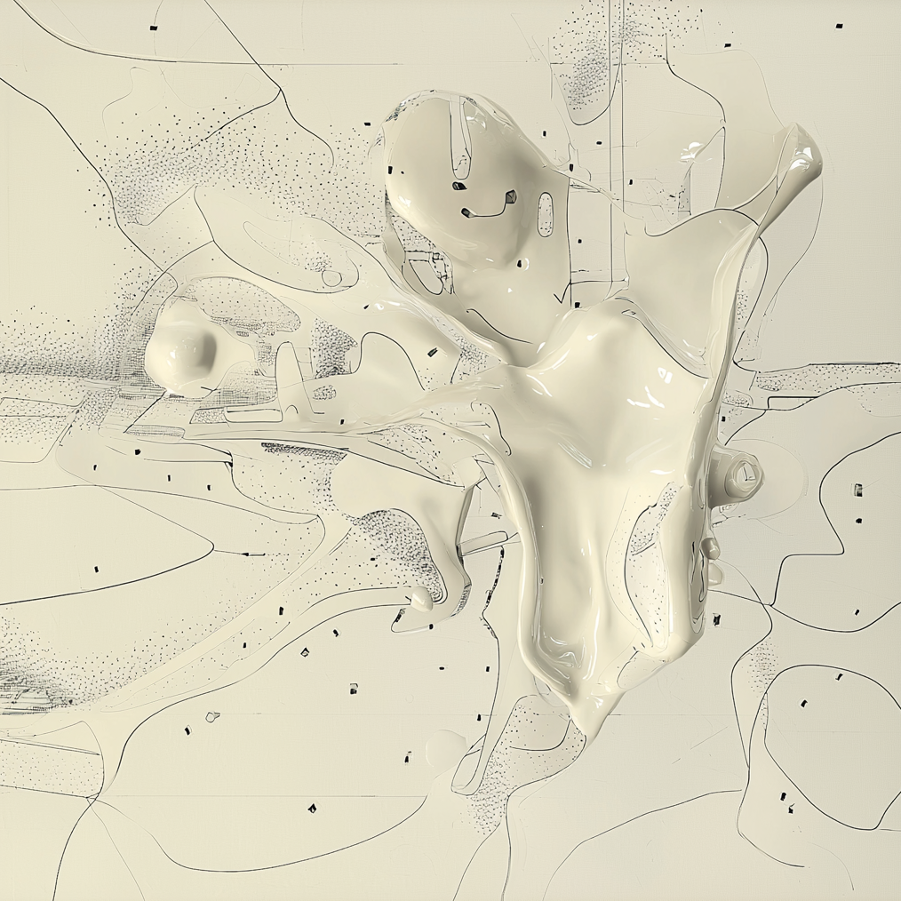 From there, I tried fusing that language with sets of abstract liquid forms I had been generating in another run. After enough button clicking, I started wondering what would happen if something more representational entered the mix, like a human figure. Slowly, bits and pieces of figures began to emerge from the goo.
