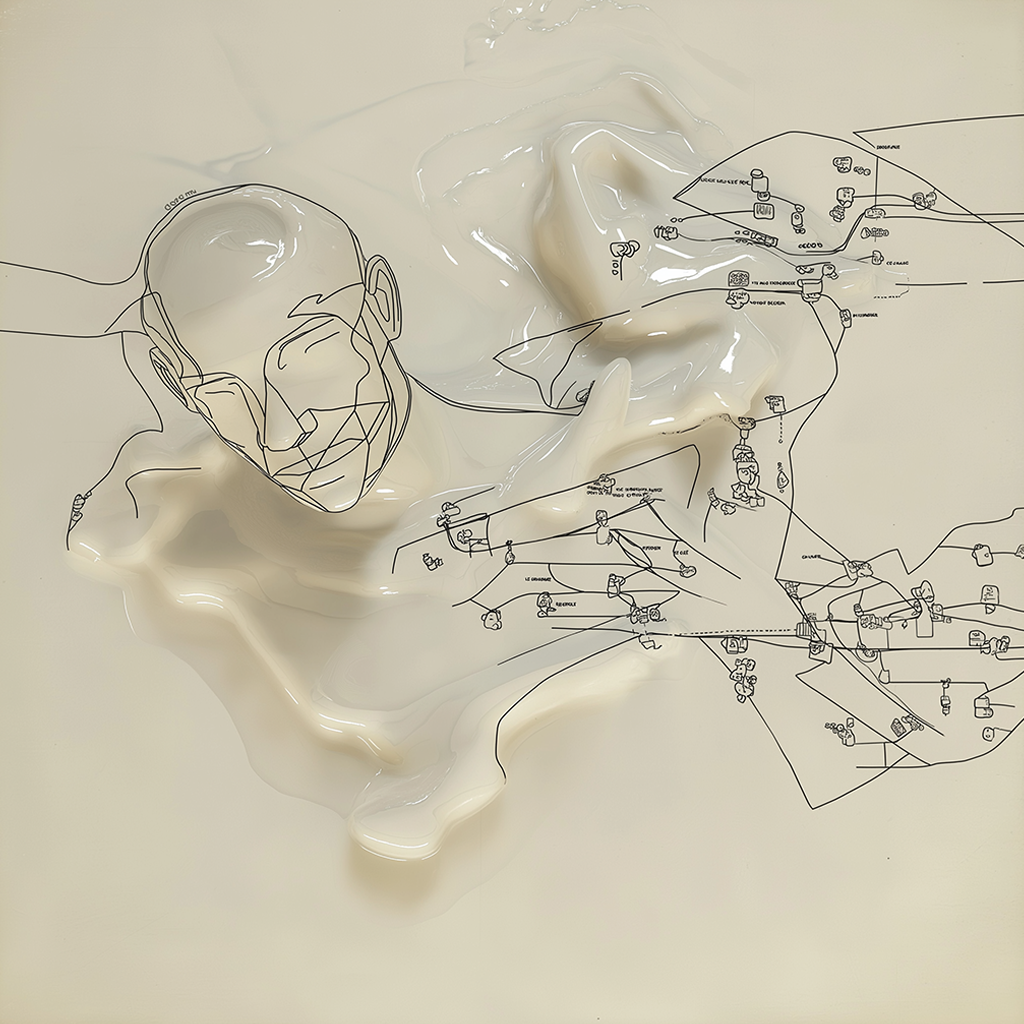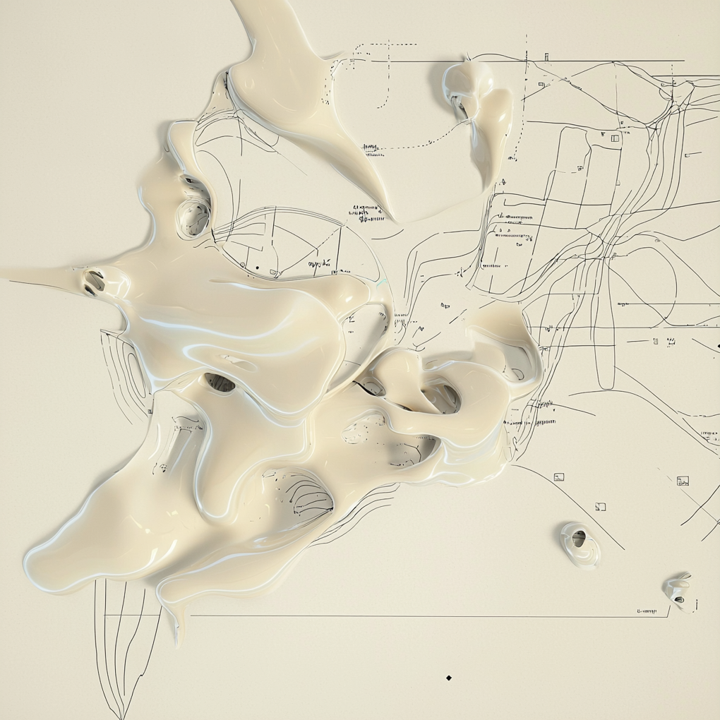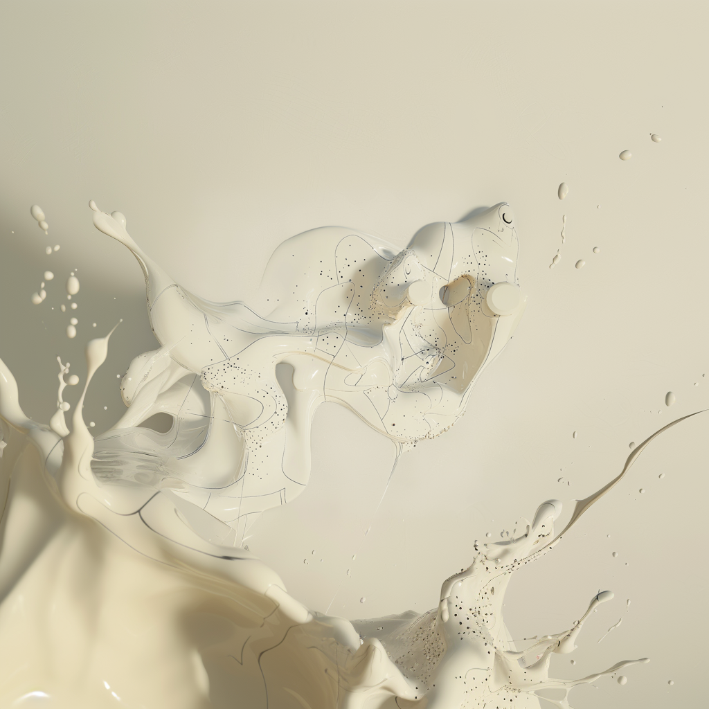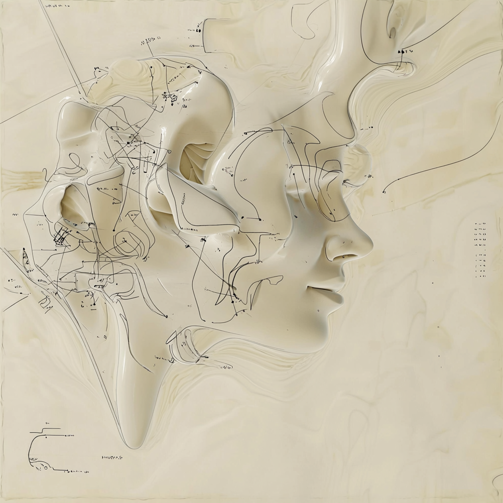 From there, I tried fusing that language with sets of abstract liquid forms I had been generating in another run. After enough button clicking, I started wondering what would happen if something more representational entered the mix, like a human figure. Slowly, bits and pieces of figures began to emerge from the goo.