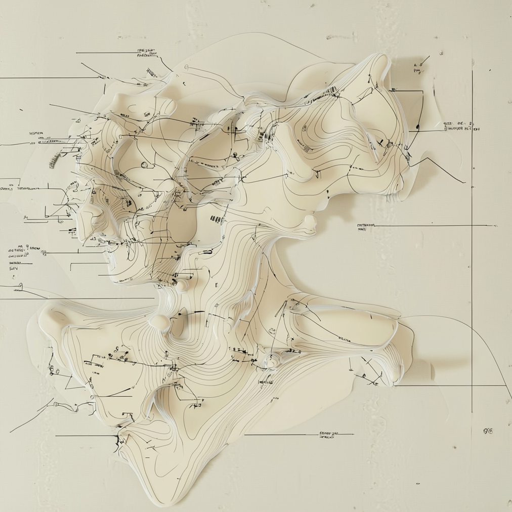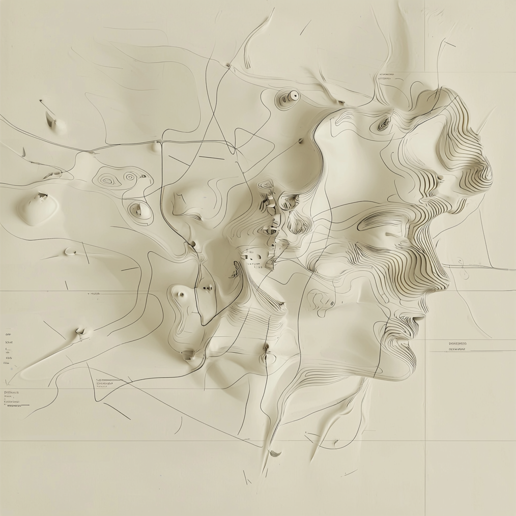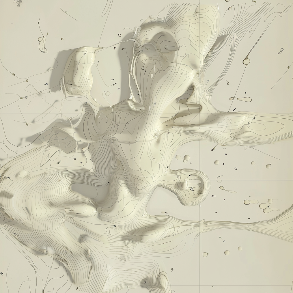 One part of the process was creating an abstract, diagrammatic style that wasn’t tied to anything overtly representational. I found maps and cartography useful in that regard. If you don’t know what kind of map you’re looking at or what it represents, it can read as a collection of beautiful colors and lines rather than instructions. Terrain maps in particular, with their contour lines, repetition, and elevation data, feel wonderfully abstract.